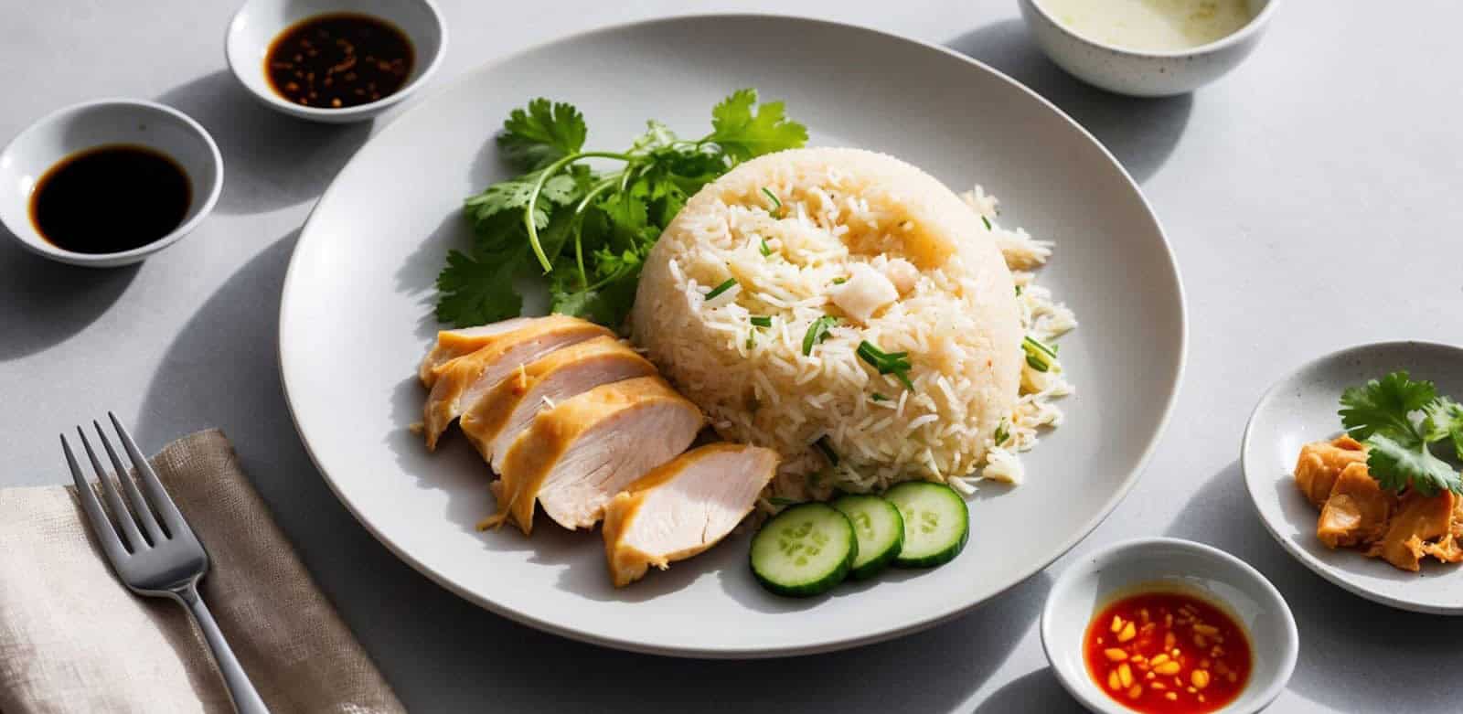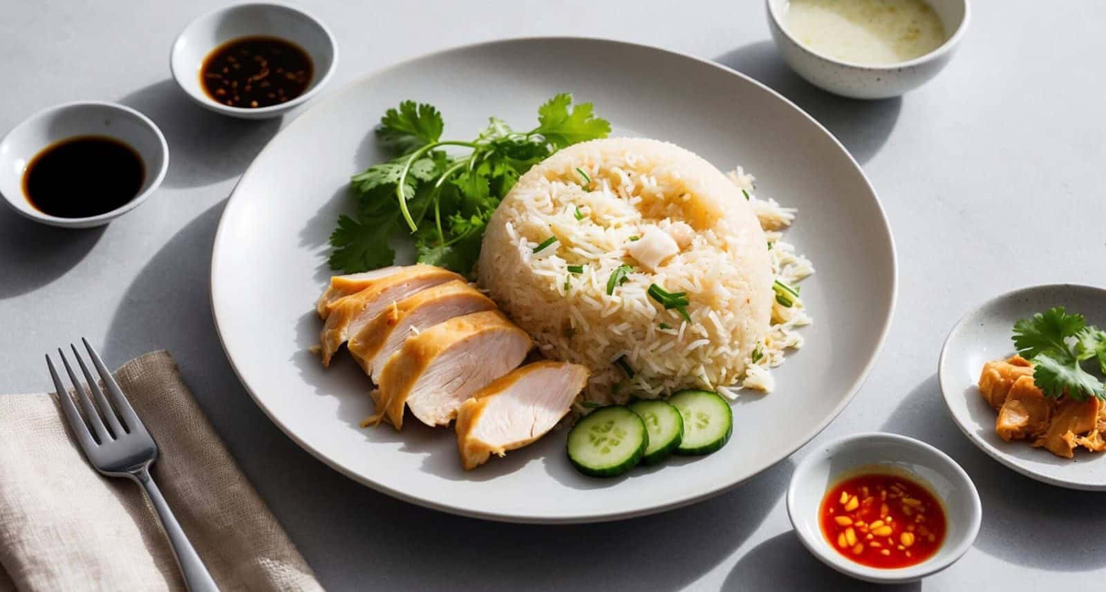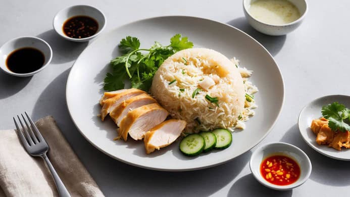 A beloved Singaporean dish featuring tender poached chicken served with fragrant rice and accompanied by a trio of dipping sauces.
