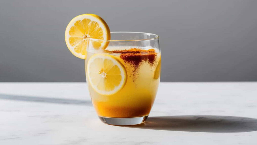 - In a tall glass, add the sliced lemon, grated turmeric, and grated ginger.1/2 lemon, 1 small fresh turmeric, 1 small fresh ginger
