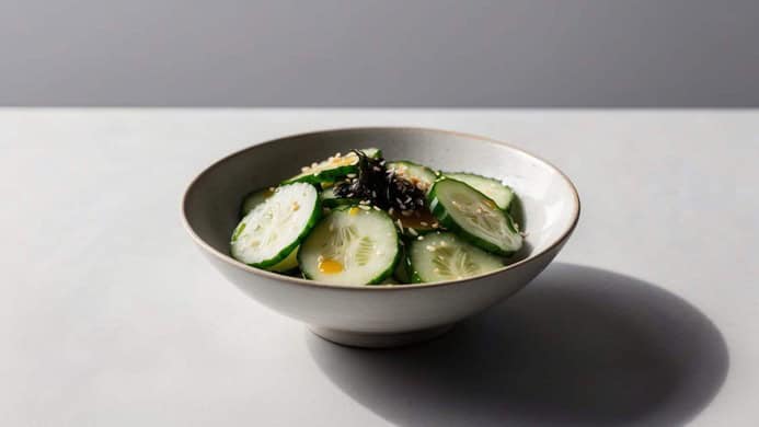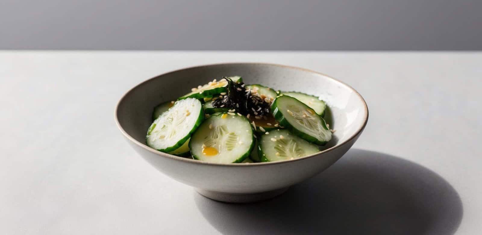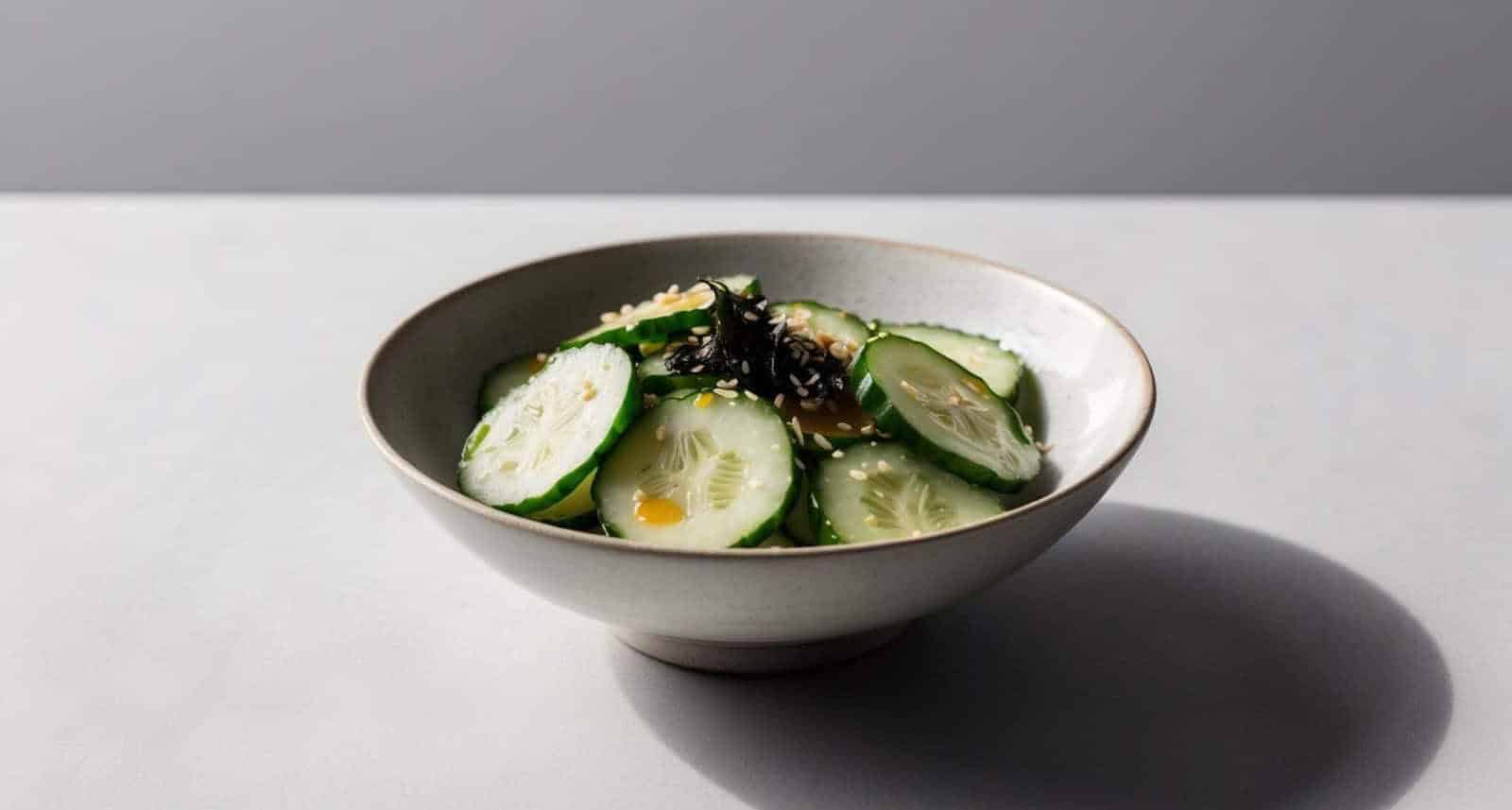- In the serving bowl, combine the sliced cucumbers and rehydrated wakame (if using). Pour the dressing over the mixture and toss gently to coat the cucumbers evenly.