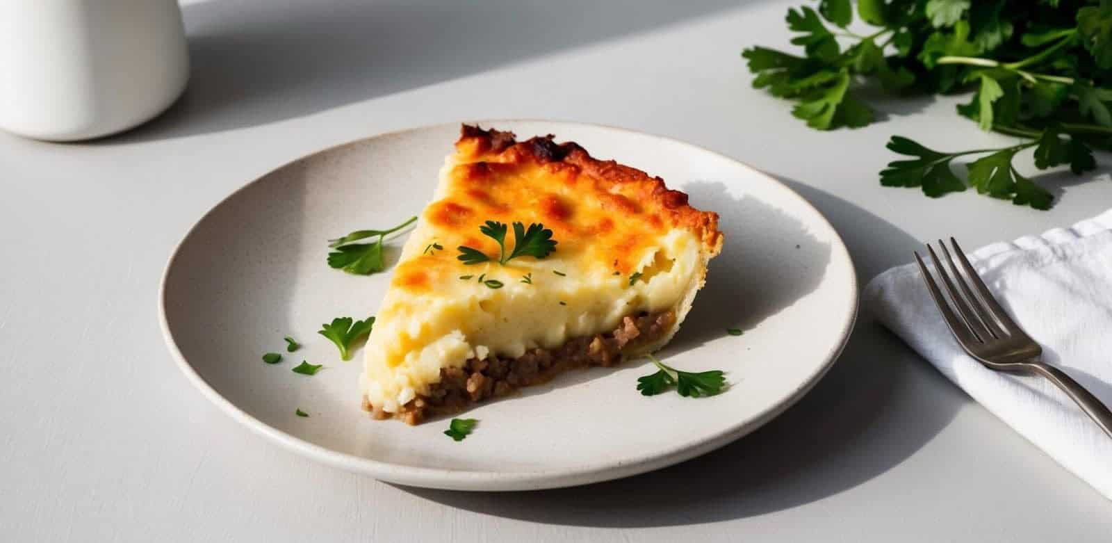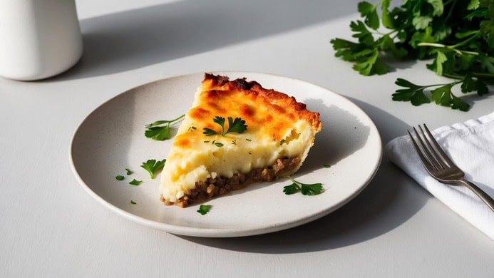 A classic and hearty shepherd’s pie with a savory filling of minced lamb and vegetables, topped with creamy mashed potatoes.