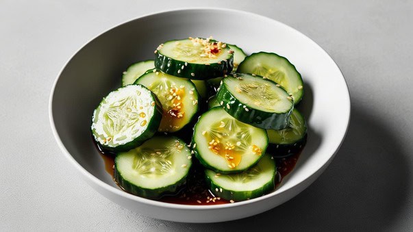 - Pour the dressing over the cucumber slices and toss to coat evenly. Ensure all pieces are well-coated with the flavorful mixture.