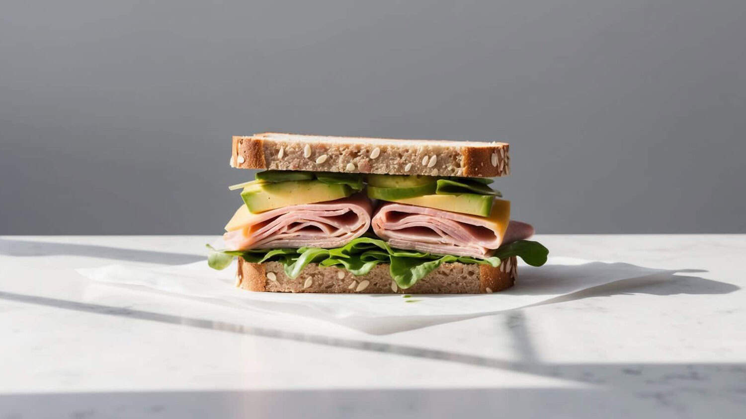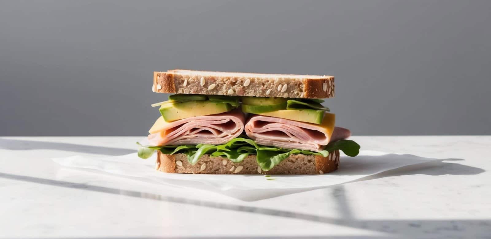 - Layer ham or turkey, cheese, avocado slices, and mixed greens on one slice of bread.2 slices ham, 2 slices cheese, 1/2 avocado, 1 handful mixed greens