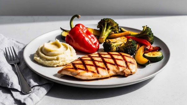 - Plate the grilled chicken with a wedge of lemon on the side, add a generous serving of roasted vegetables, and a scoop of creamy garlic mashed potatoes.lemon slices, Fresh thyme
