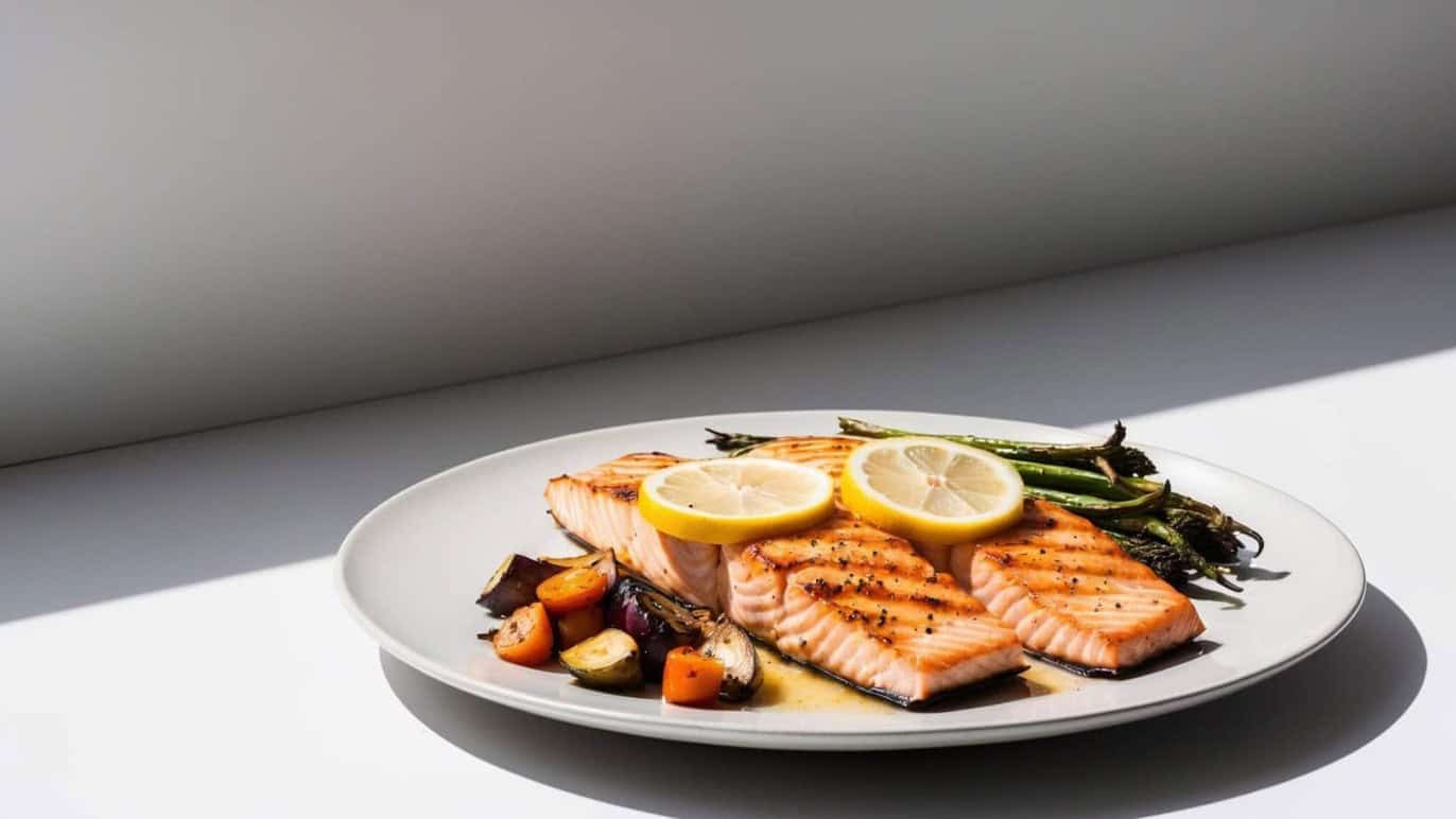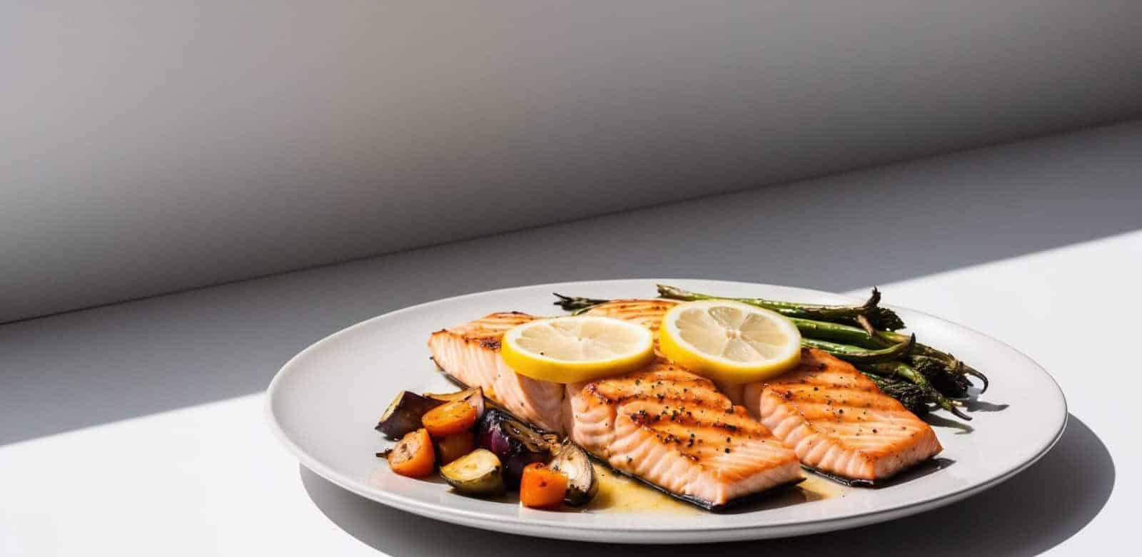A wholesome and hearty dinner featuring grilled salmon fillets served with a side of roasted vegetables.