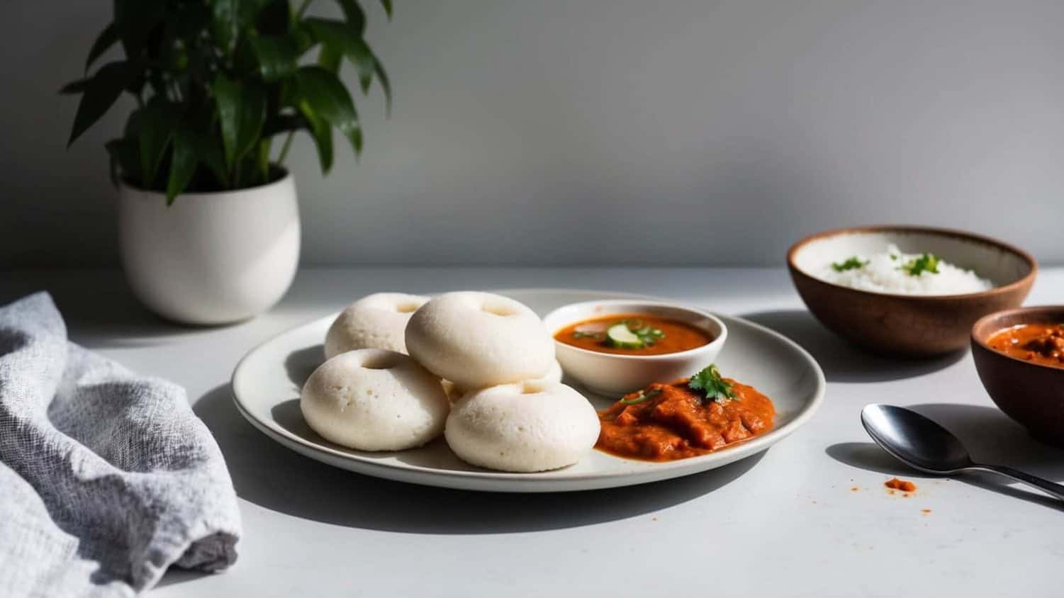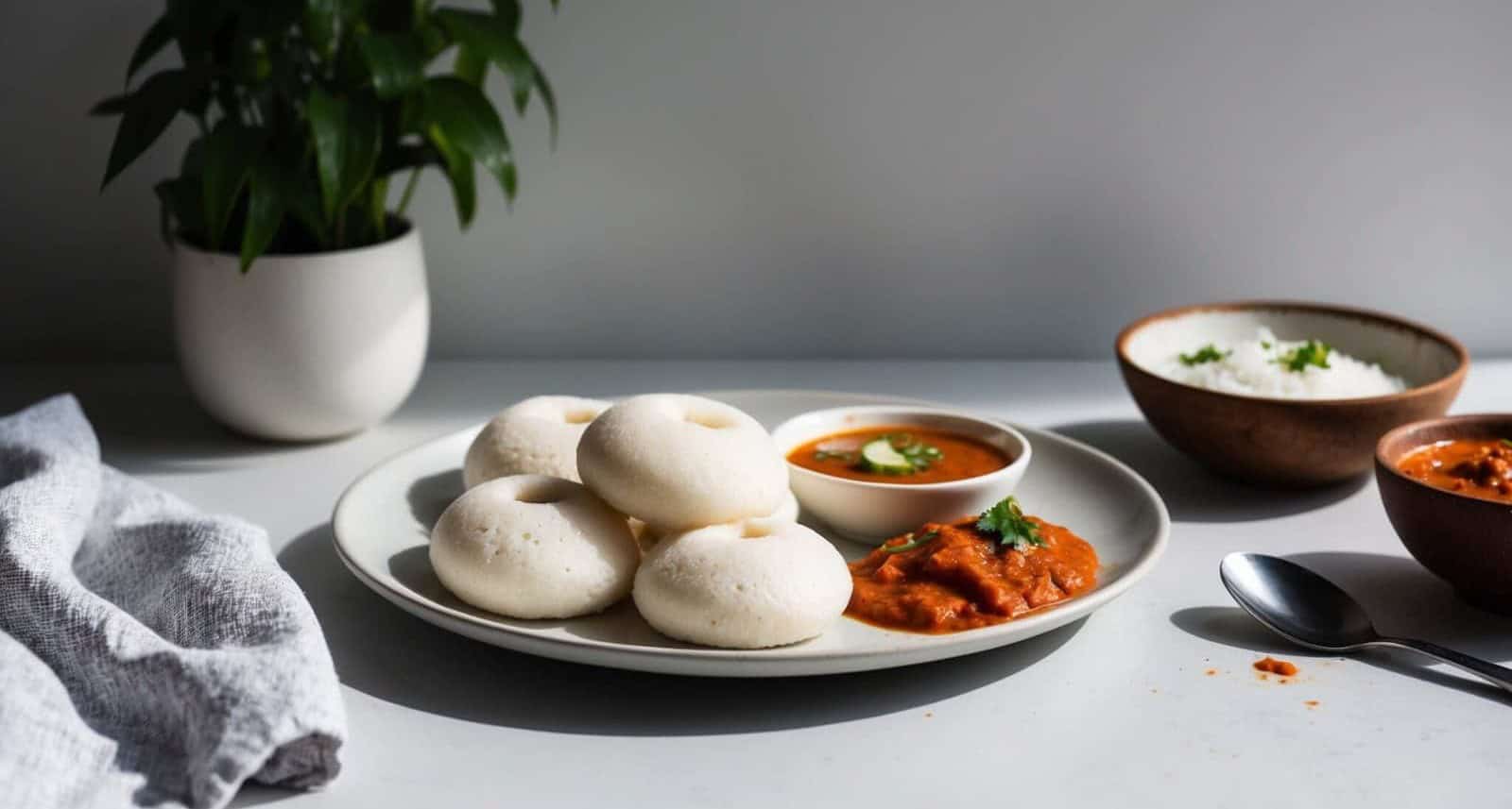 Serve idlis hot with coconut chutney and sambar for a traditional South Indian breakfast.