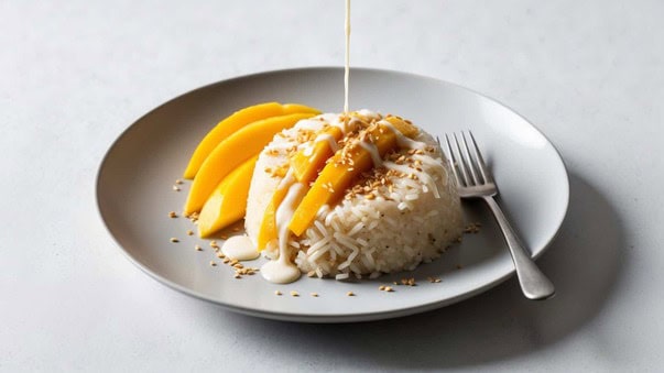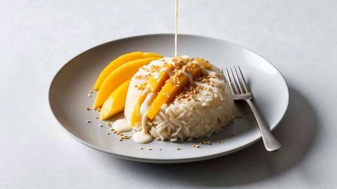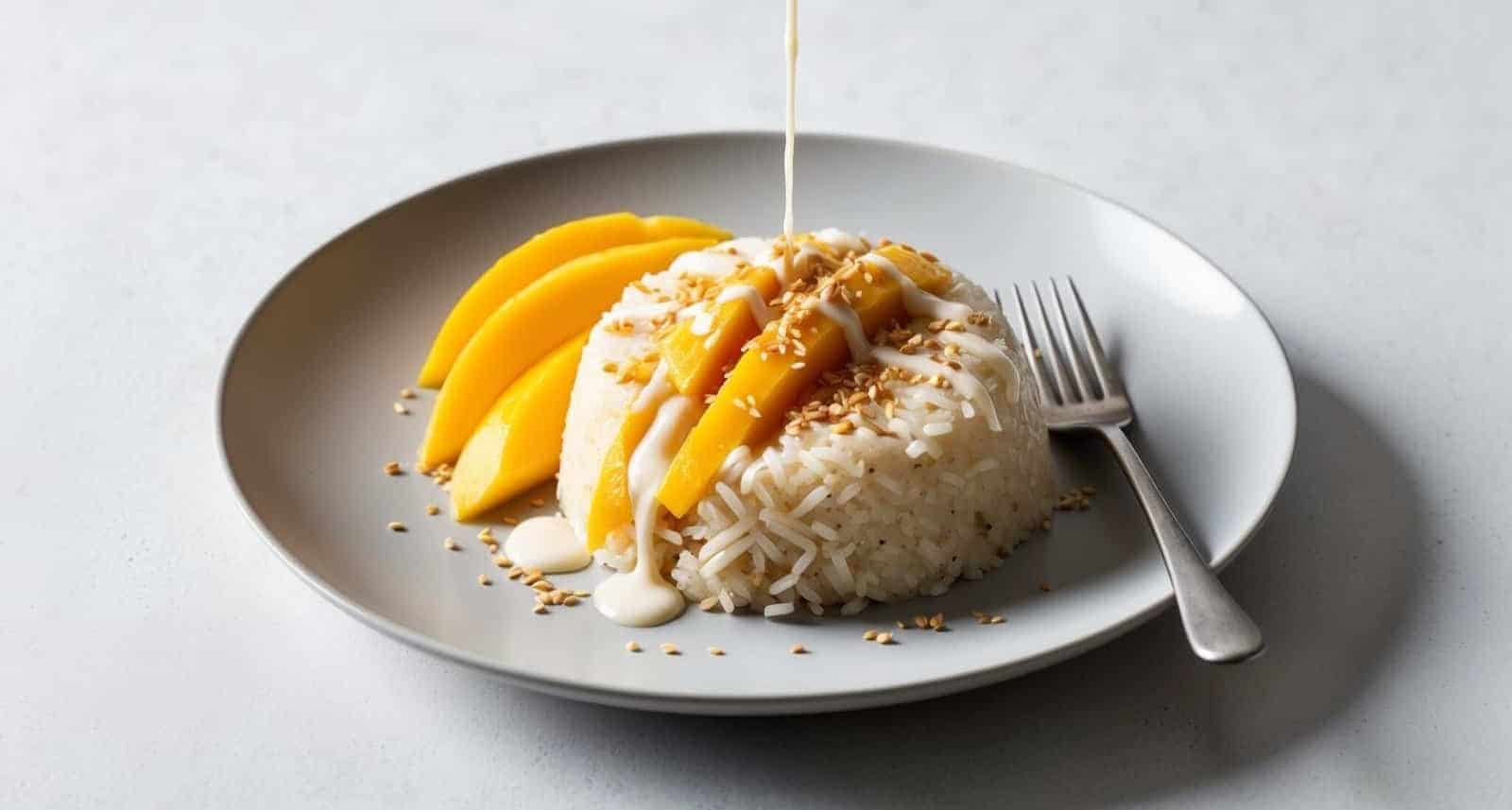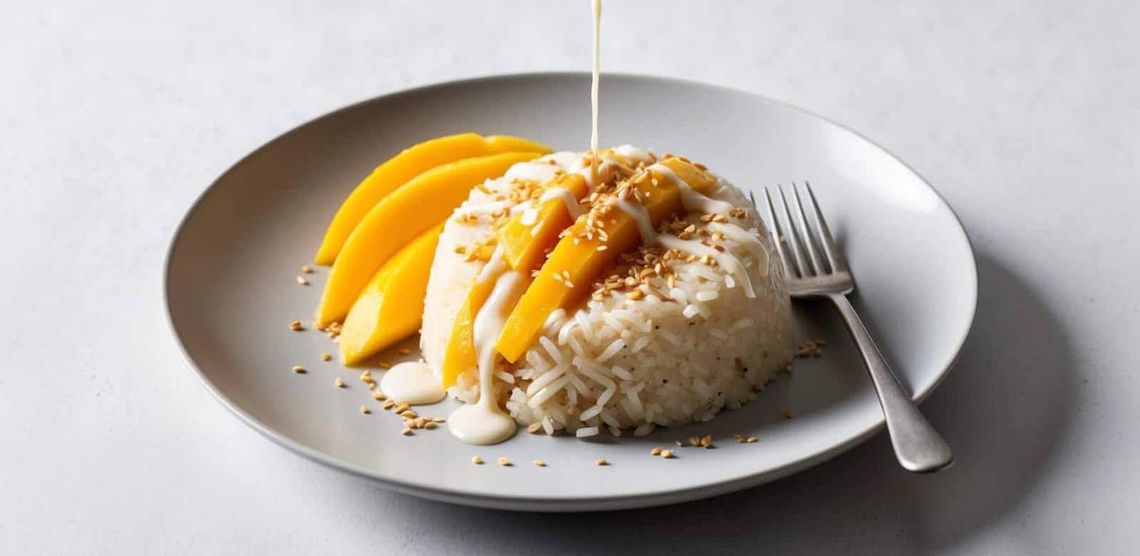 - To serve, place a portion of the sticky rice on a plate, top with mango slices, and drizzle with the remaining coconut milk. Sprinkle with toasted sesame seeds if desired.1 mango, 1 tablespoon sesame seeds