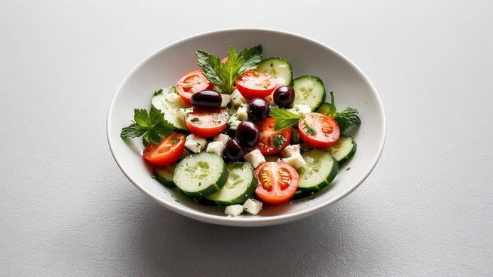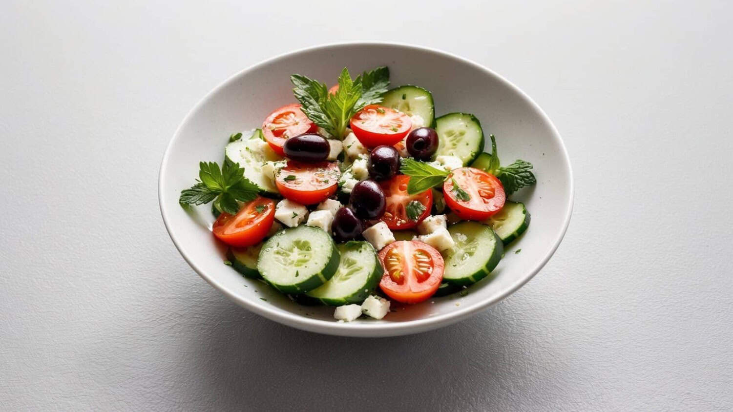 - In a large bowl, add the sliced cucumber, halved cherry tomatoes, halved kalamata olives, crumbled feta cheese, and thinly sliced red onion.1/2 cup cherry tomatoes, 1/4 cup kalamata olives, 1/4 cup crumbled feta cheese, 1/4 red onion