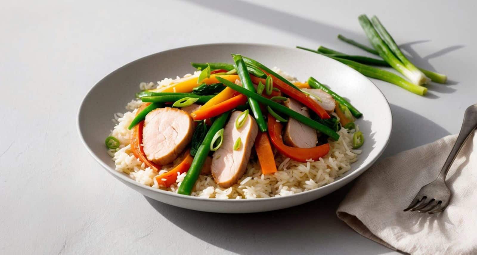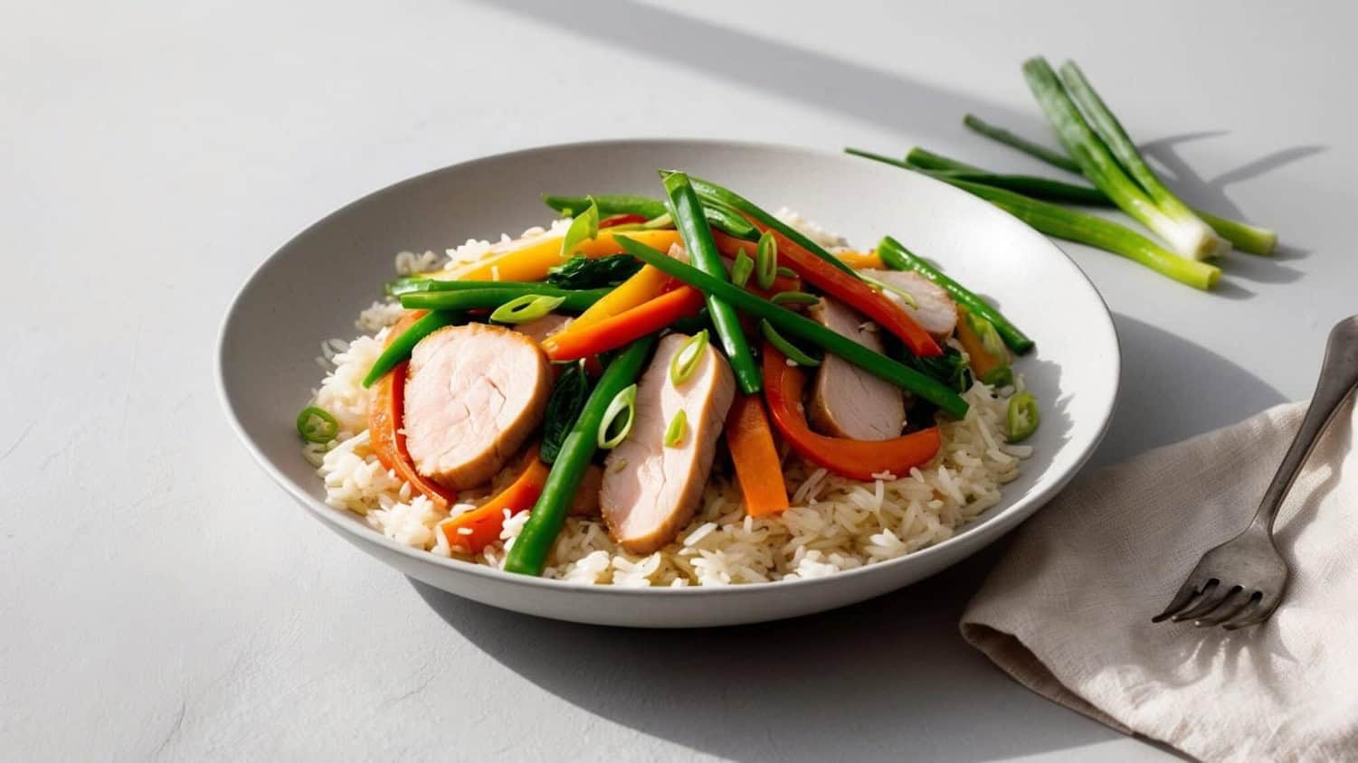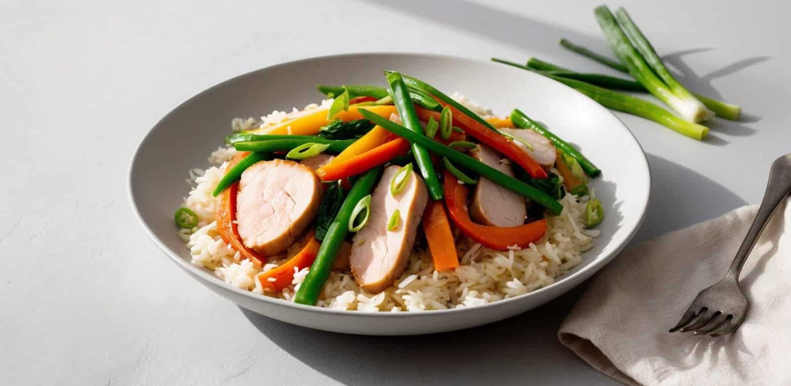 - Serve the stir-fried pork and vegetables over jasmine rice, garnished with sliced green onions.Green onions