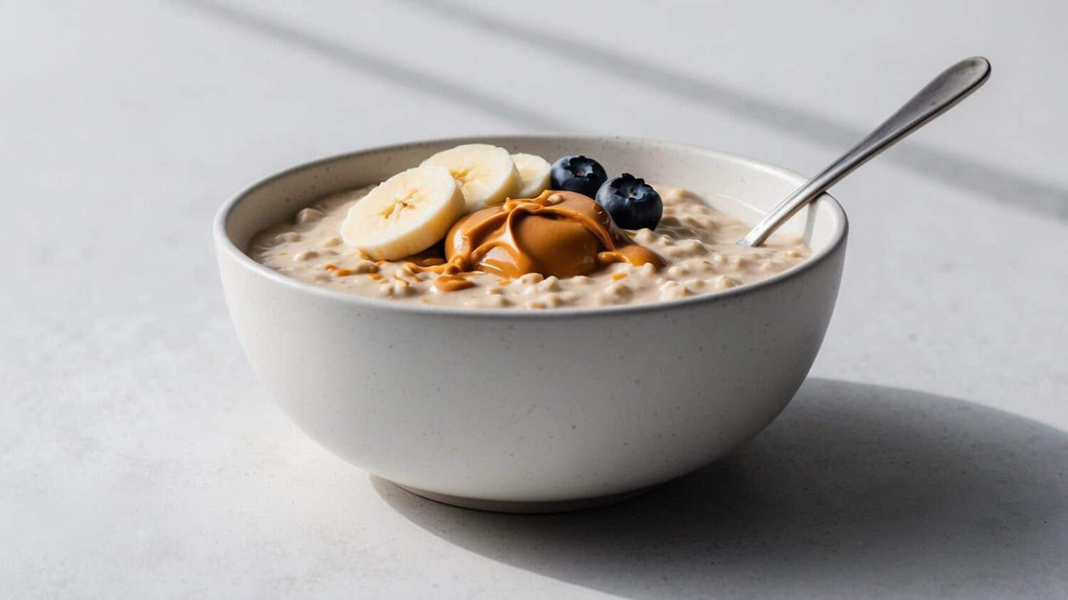 A protein-packed breakfast of creamy oatmeal mixed with protein powder and a dollop of peanut butter for added flavor and energy.