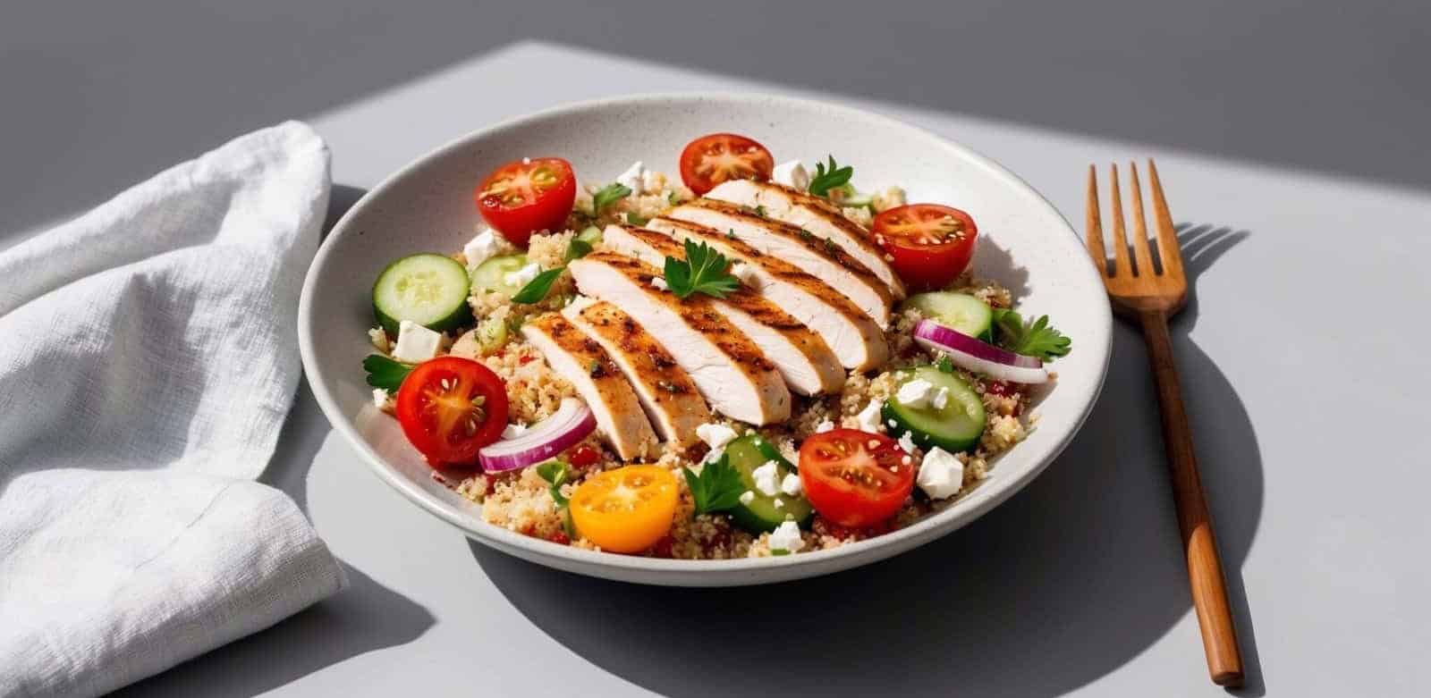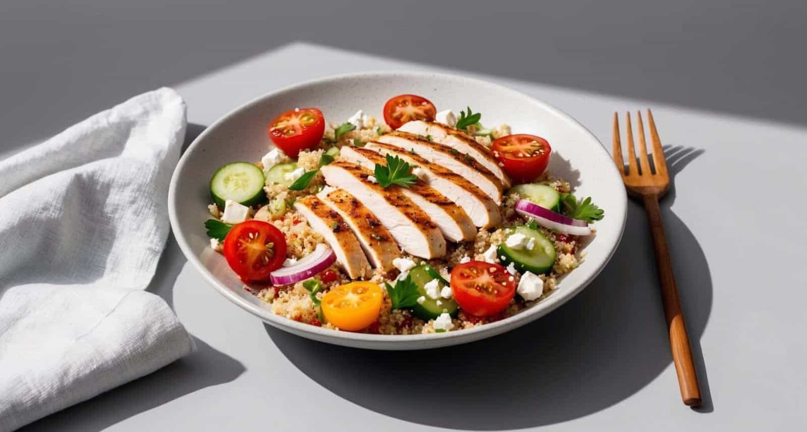 A light and nutritious quinoa salad topped with grilled chicken and fresh vegetables.