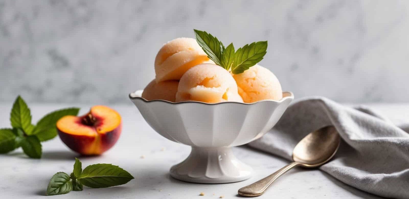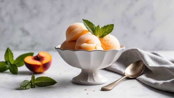 - Scoop the ginger peach sorbet into dessert bowls. Garnish with fresh mint or basil if desired, and serve with roasted or grilled peach slices for an extra treat.mint leaves