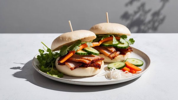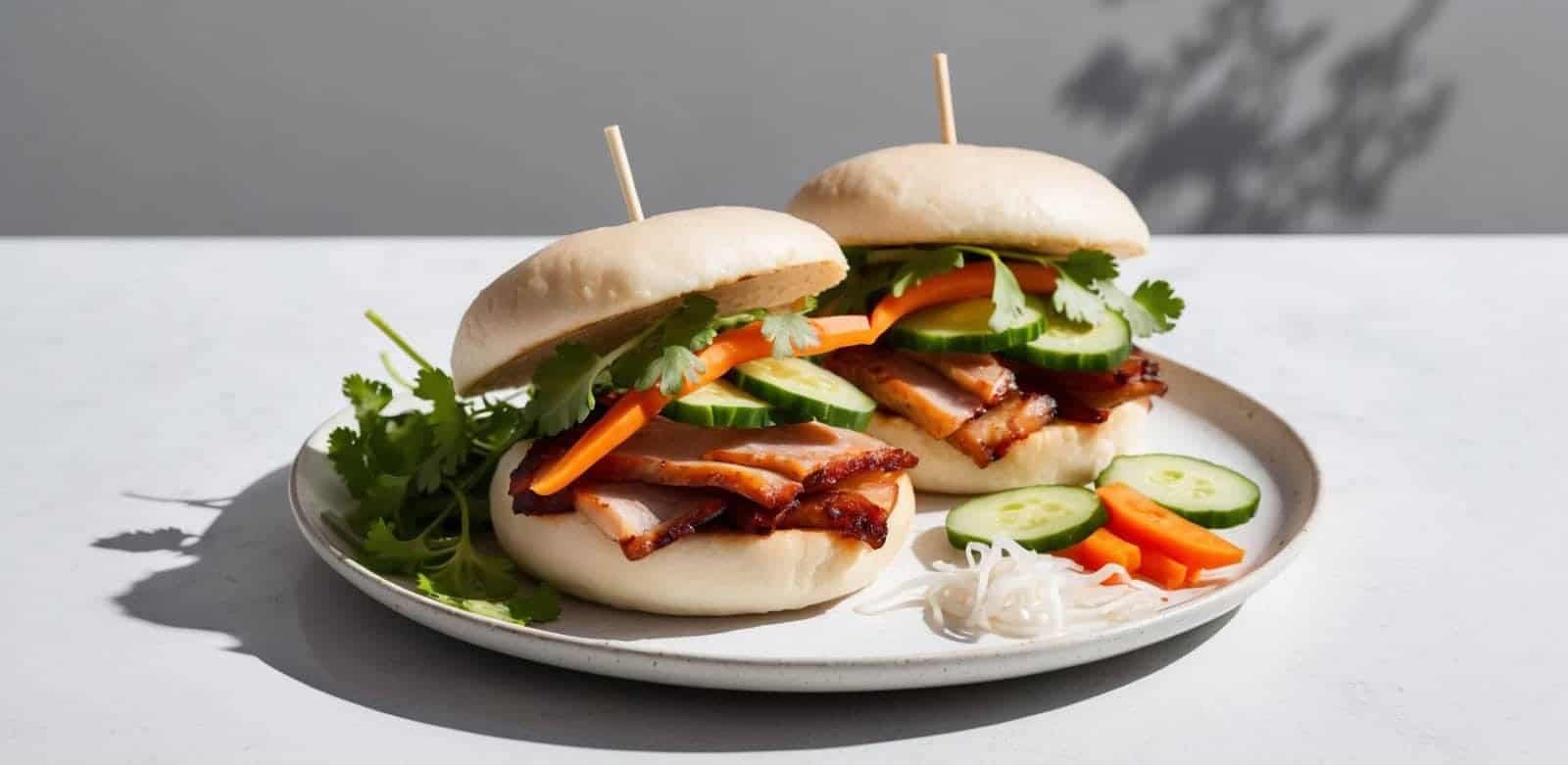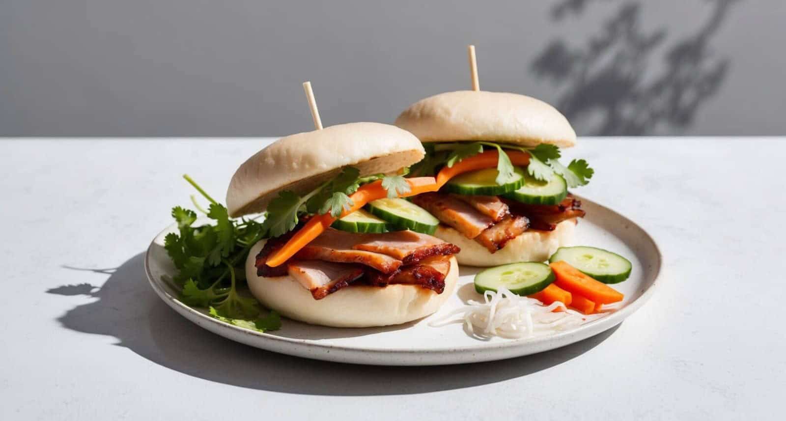 - Fill each bun with a slice of pork belly, cilantro, cucumber, and pickled carrots and daikon.Fresh cilantro, cucumber, carrots, daikon