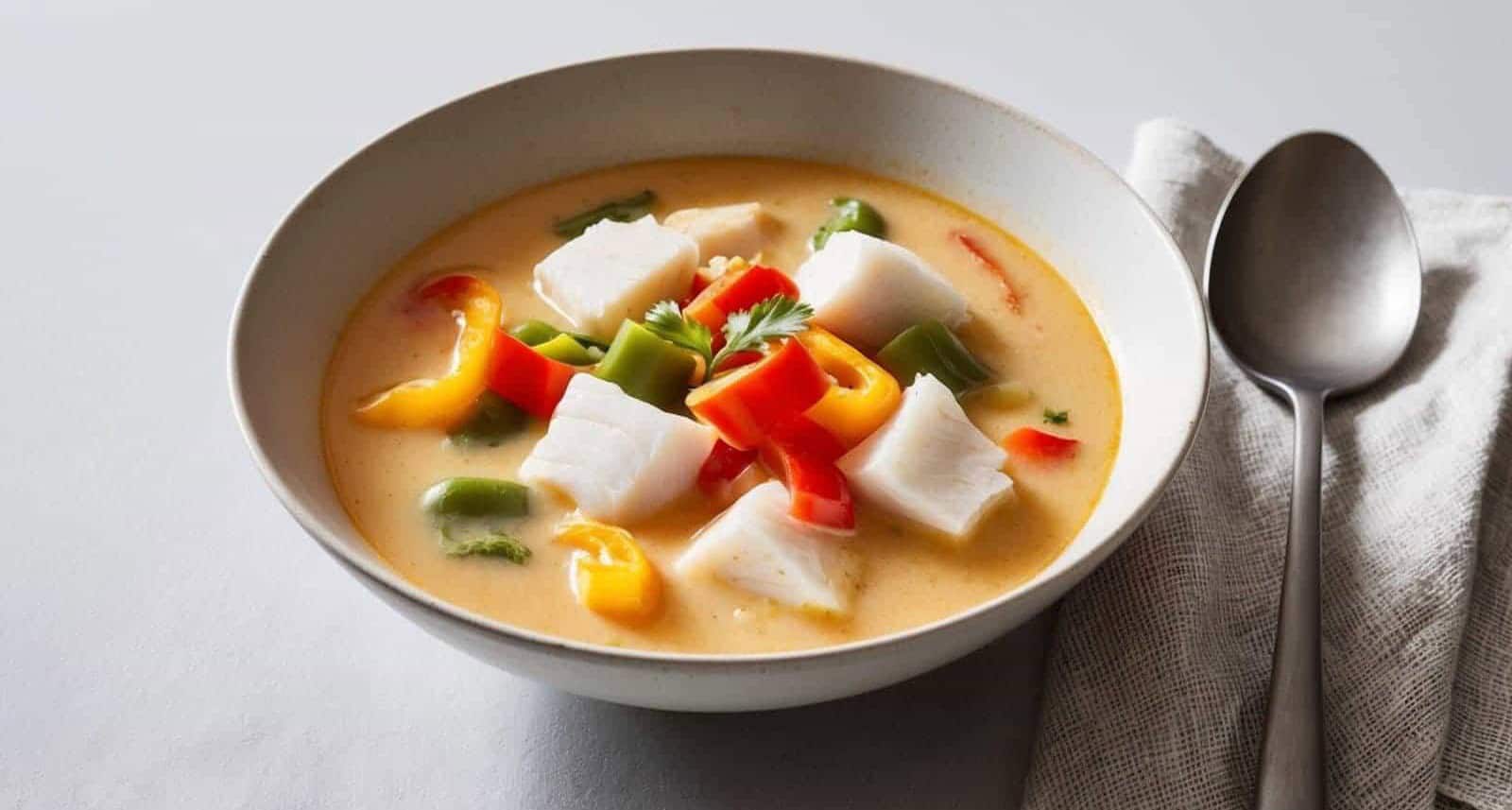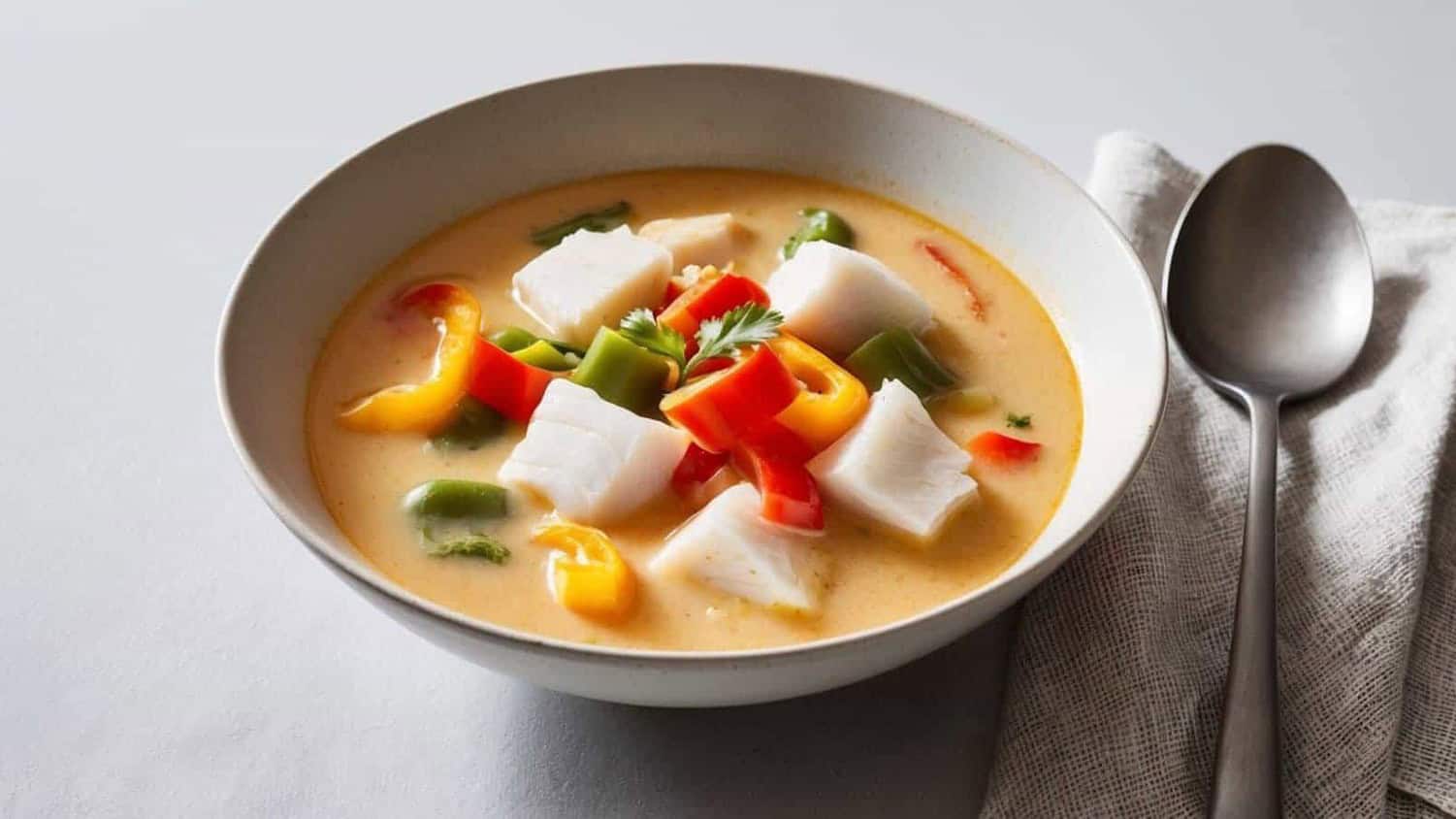 - Pour in the coconut milk and fish stock. Bring to a simmer.1 cup coconut milk, 1 cup fish stock